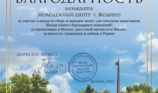 «Живая память благодарных поколений» — это проект, в рамках которого устанавливаются народные памятники, объединяющие в своем сплаве советские монеты, принесенные людьми. Молодежный центр активно участвовал в данном проекте и организовал сбор монет среди жителей нашего города. За эту активную работы мы получили благодарственное письмо с о словами: «Ваша поддержка и энтузиазм стали неотъемлемой частью нашего [Читать далее] ««Живая память благодарных поколений»»